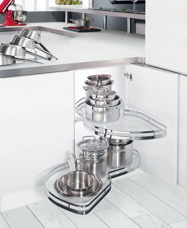Le Mans jest rozwiązaniem do szafki narożnikowej, które łączy w sobie wysoki stopień wykorzystania przestrzeni z prostym, ale bardzo innowacyjnym sposobem wysuwania półek na zewnątrz. Półki działają niezależnie od siebie, co ułatwia dostęp do artykułów znajdujących się na nich. Teraz możesz widzieć całą zawartość szafki i łatwo dotrzeć do każdego elementu, którego potrzebujesz.