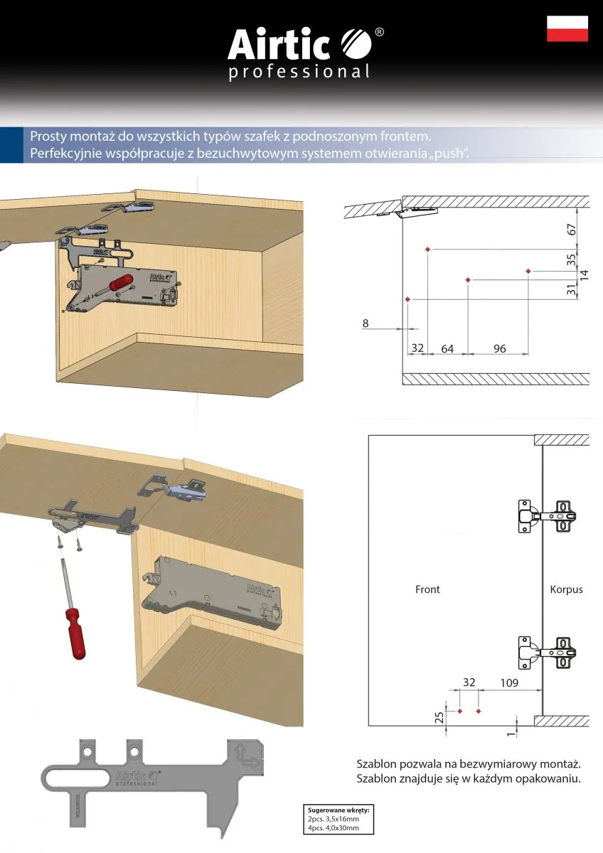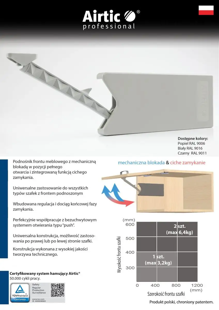 Podnośnik Airticlift II uniwersalny popiel wyróżnia się intuicyjnym mechanizmem, dociągiem fazy końcowej domyku oraz łatwą regulacją położenia frontu. Podnośnik został wyposażony w system blokady, która pozwala na utrzymanie różnego położenia frontu szafki. Umożliwia pełne otwarcie i pozostawienie jej w tej pozycji, ponowne uniesienie frontu spowoduje zamknięcie szafki. Swobodne unoszenie frontu i wbudowany amortyzator doskonale sprawdzają się w codziennym użytkowaniu mebla.