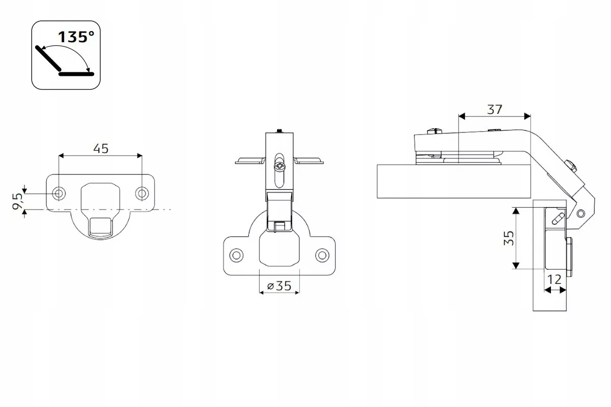 Zawias KĄTOWY 135° ø35 mm zatrzaskowy (2 szt.)