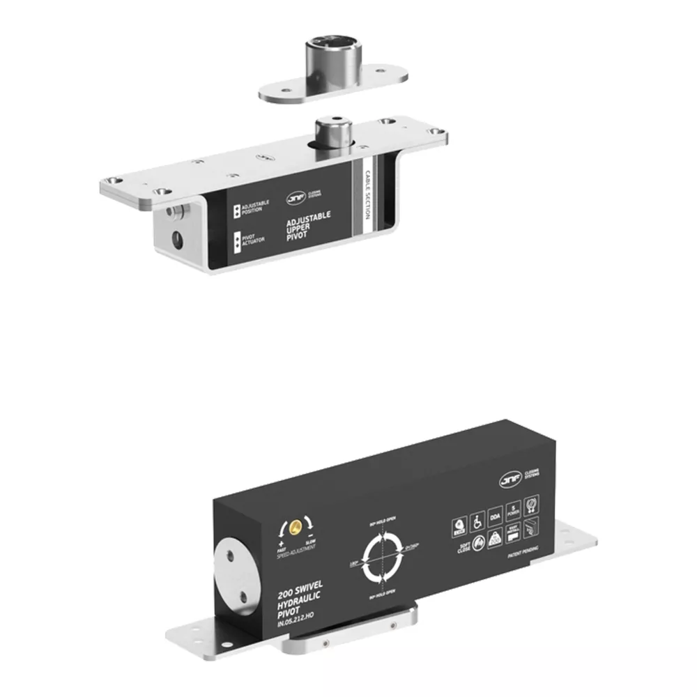 Zawias hydrauliczny do drzwi typu pivot, składający się z części górnej oraz dolnej, przeznaczony do nowoczesnych drzwi drewnianych. Wykonany z wysokiej jakości stali nierdzewnej AISI 304, zapewnia trwałość, odporność na zużycie oraz niezawodne działanie nawet przy intensywnej eksploatacji.
