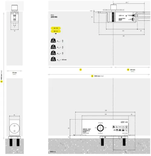 W górnej części zawiasu odległość osi zawiasu od krawędzi skrzydła powinna wynosić minimum 150 mm. Dolna część zawiasu montowana jest do podłoża bez konieczności wykonywania prac murarskich, co znacząco skraca i upraszcza instalację. Zarówno górna, jak i dolna część umożliwiają precyzyjną regulację położenia skrzydła, zapewniając jego idealne wypoziomowanie.