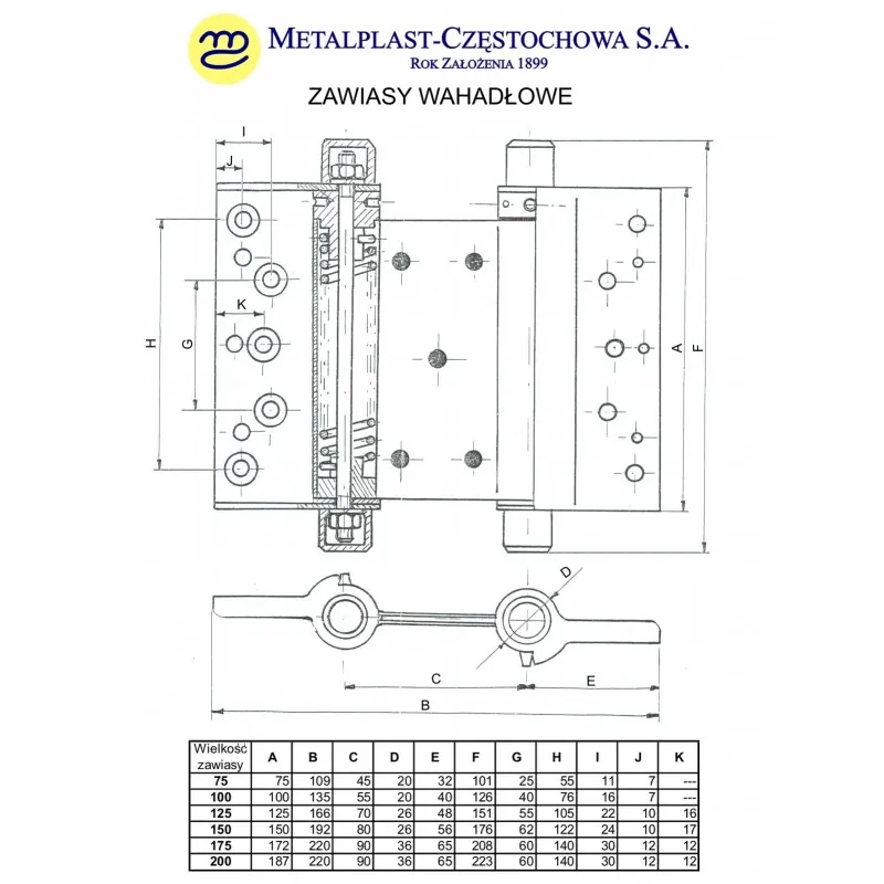 Zawias wahadłowy przeznaczony jest do wykonania ruchomego łączenia pomiędzy ościeżnicą i drzwiami – umożliwia ich otwieranie i zamykanie, po zamocowaniu pozostanie niemal niewidoczny. Zawias wykonany przez znaną i cenioną na rynku Polską firmę METALPLAST-CZĘSTOCHOWA.